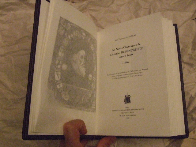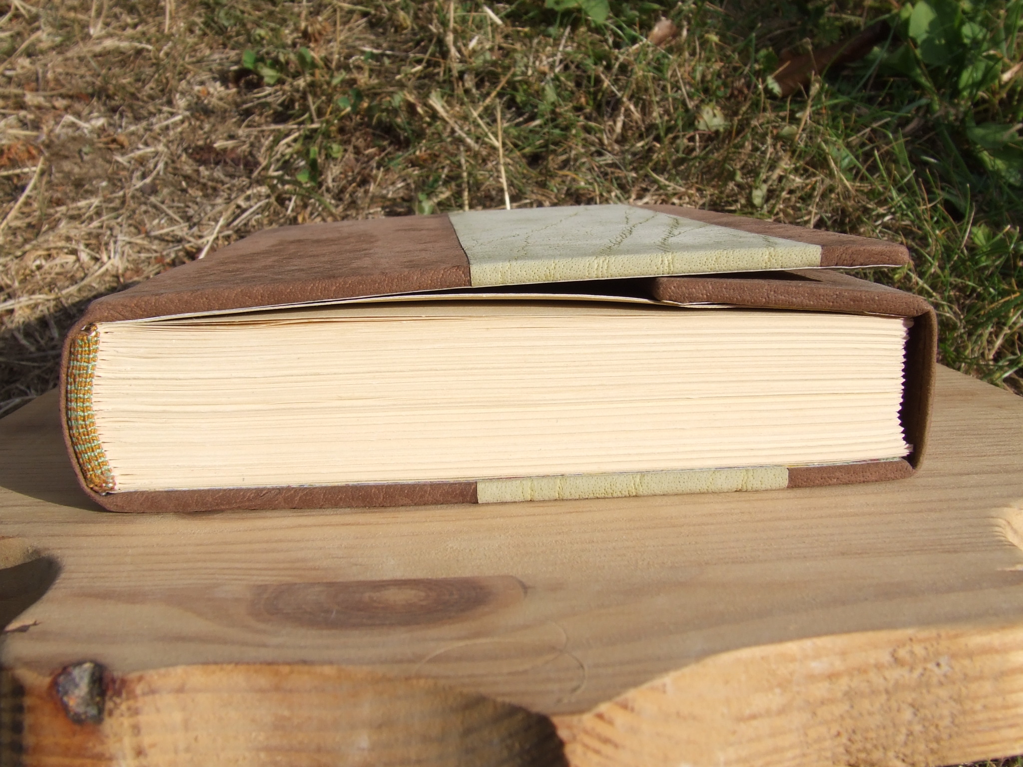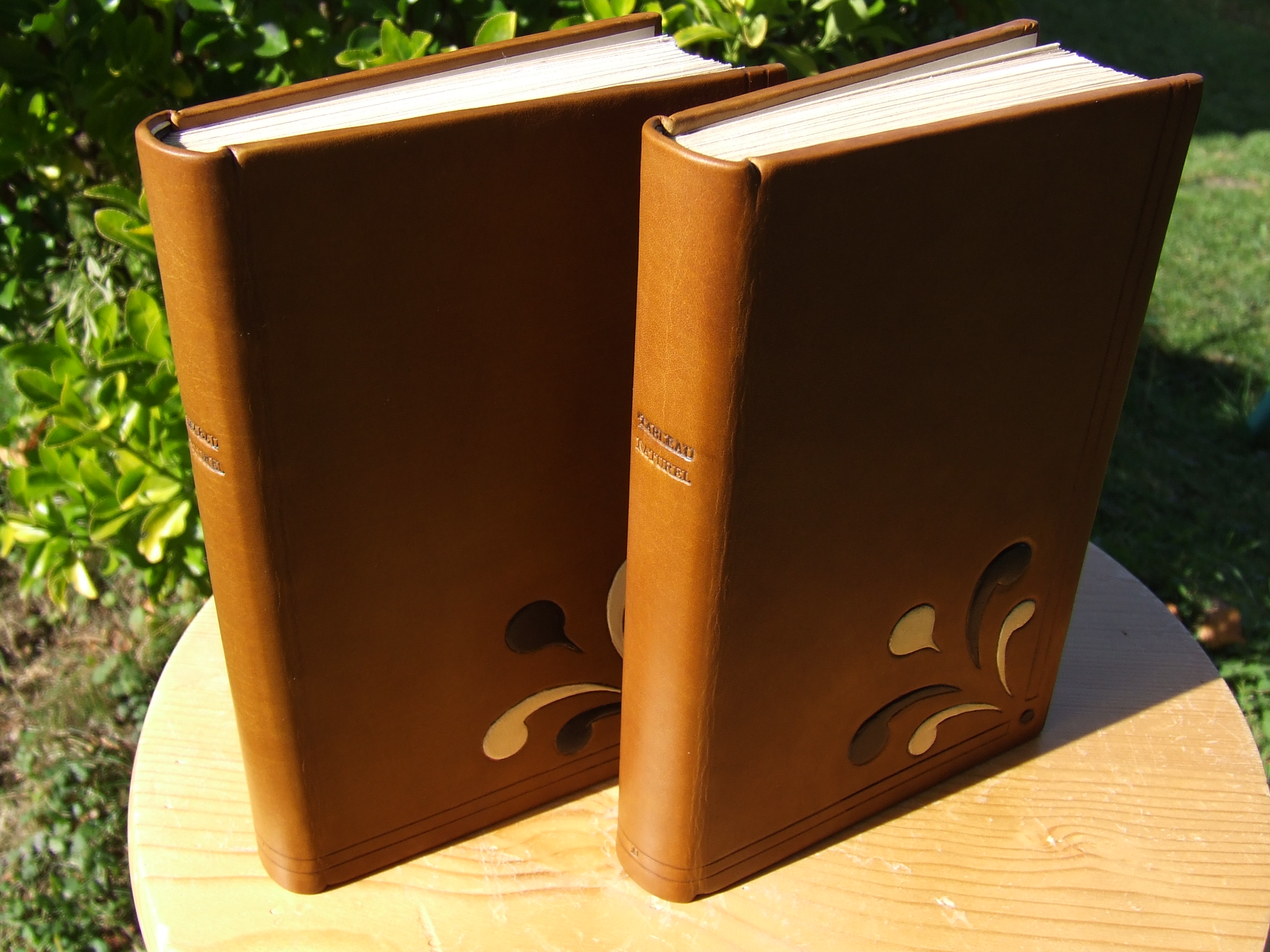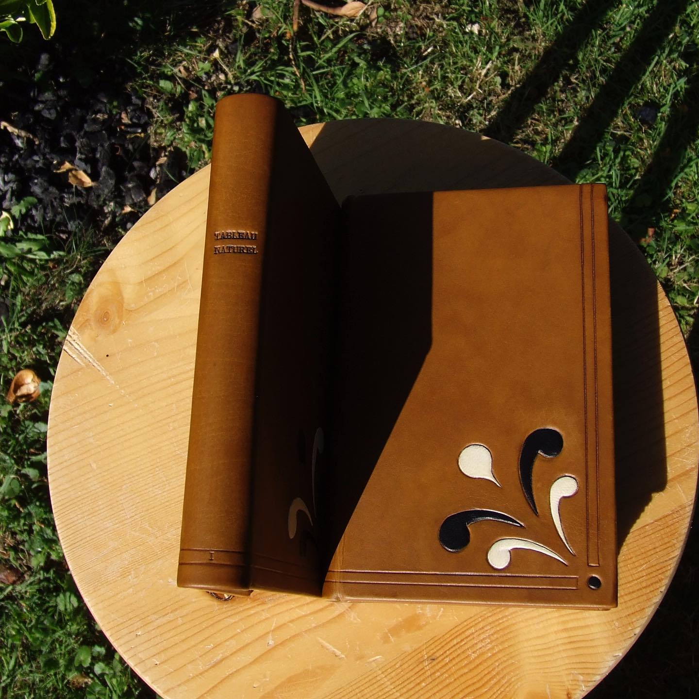 « Les Noces Chymiques de Christian Rosencreutz » de J-V Andreae, fac-similé de l’édition de Chacornac de 1928. Couture sur trois doubles nerfs, reliure plein cuir avec décor en relief sur le plat recto. Collection privée.