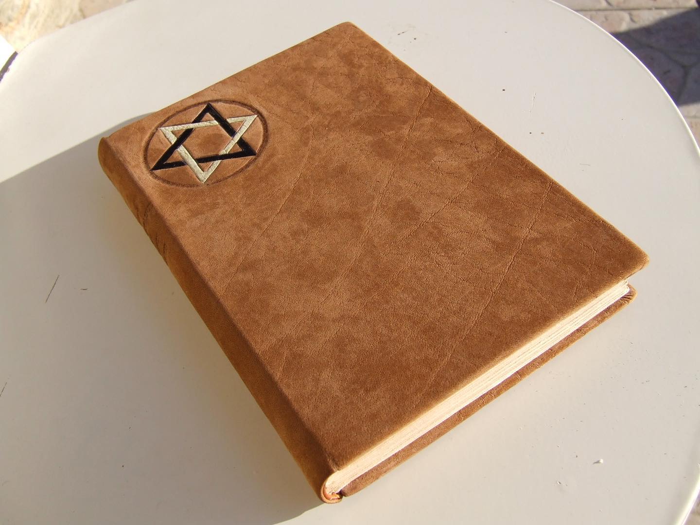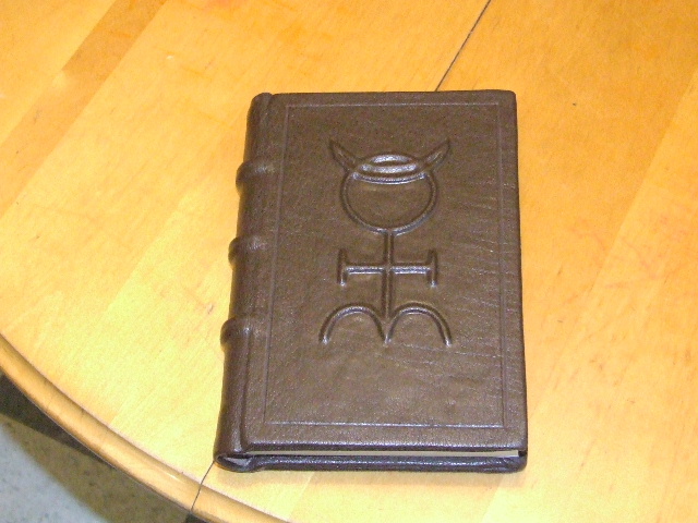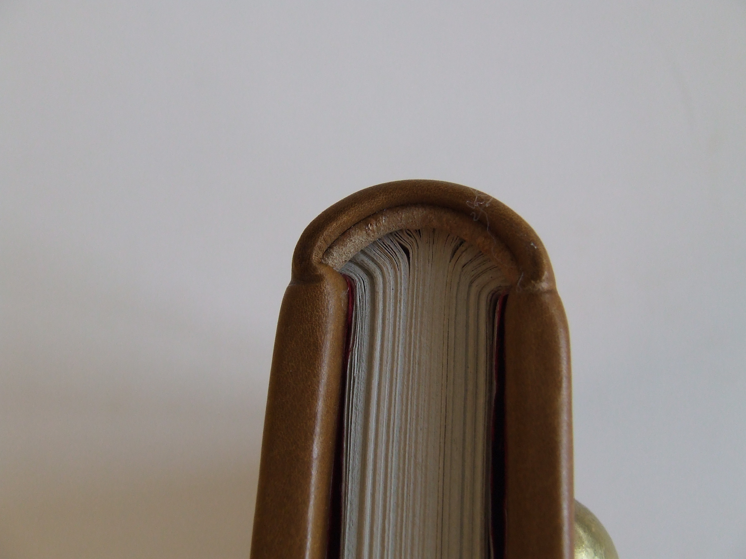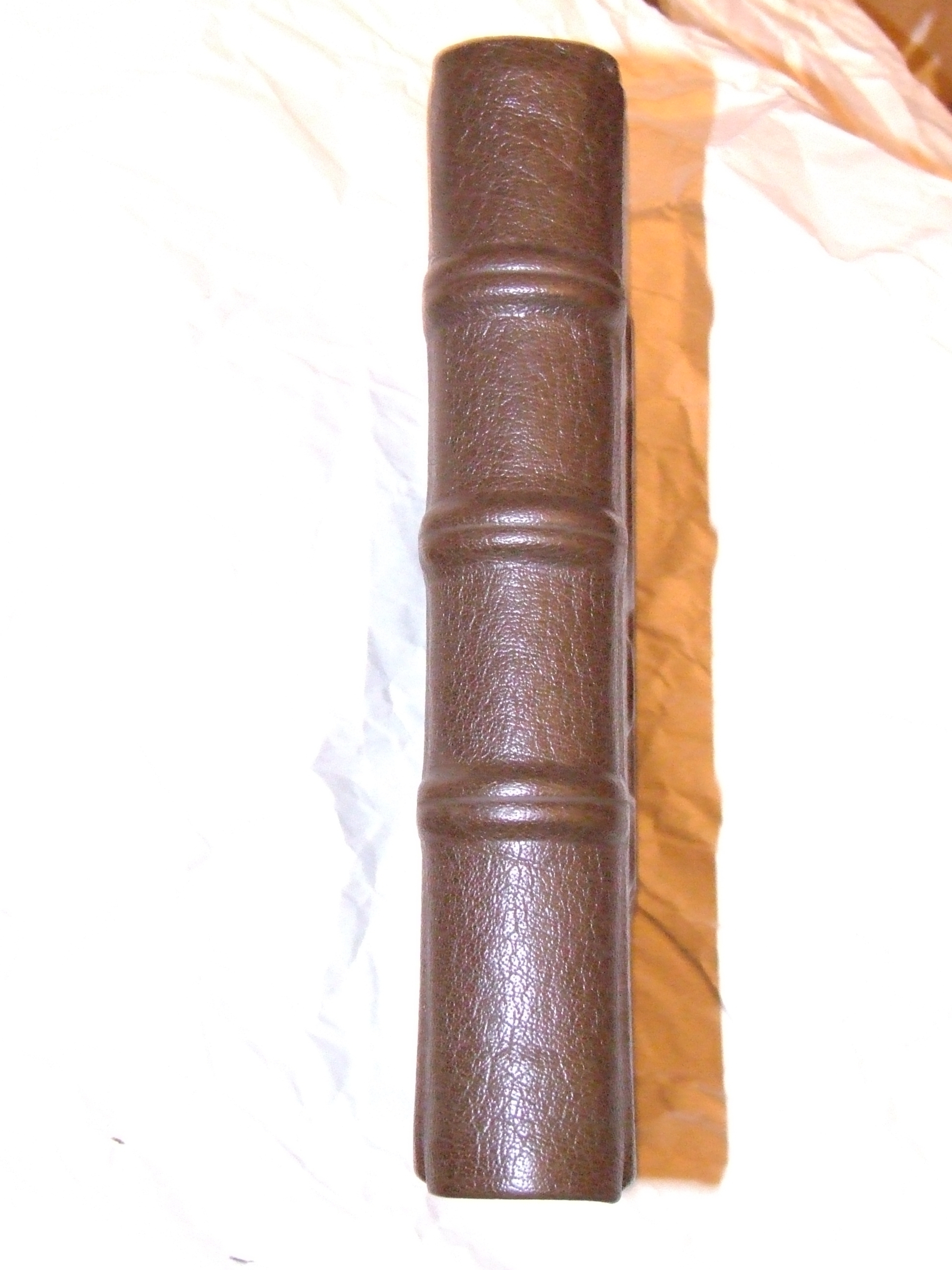 « Les Noces Chymiques de Christian Rosencreutz » de J-V Andreae, fac-similé de l’édition de Chacornac de 1928. Couture sur trois doubles nerfs, reliure plein cuir avec décor en relief sur le plat recto. Collection privée.