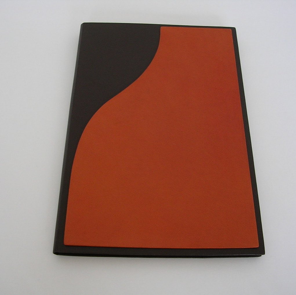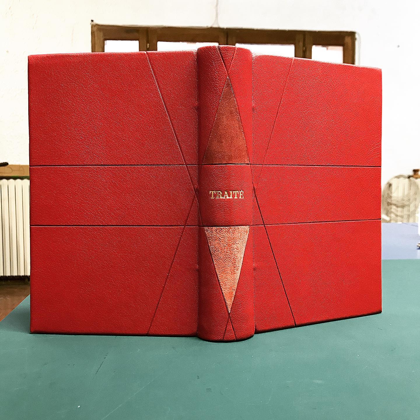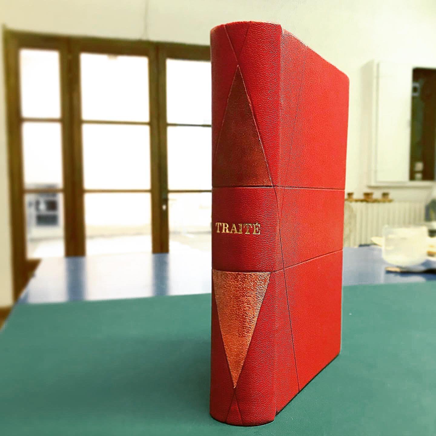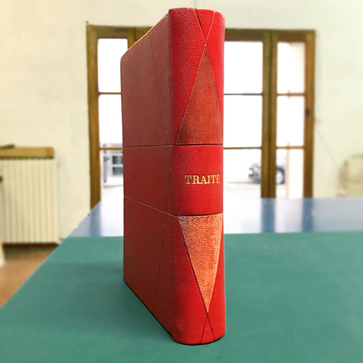 « Petite Histoire de la Musique » Ernest Van de Velde, 1924. Pleine peau sciée marron foncé avec ajout de plats en cartons recouverts de peau sciée rouge. Collection privée.