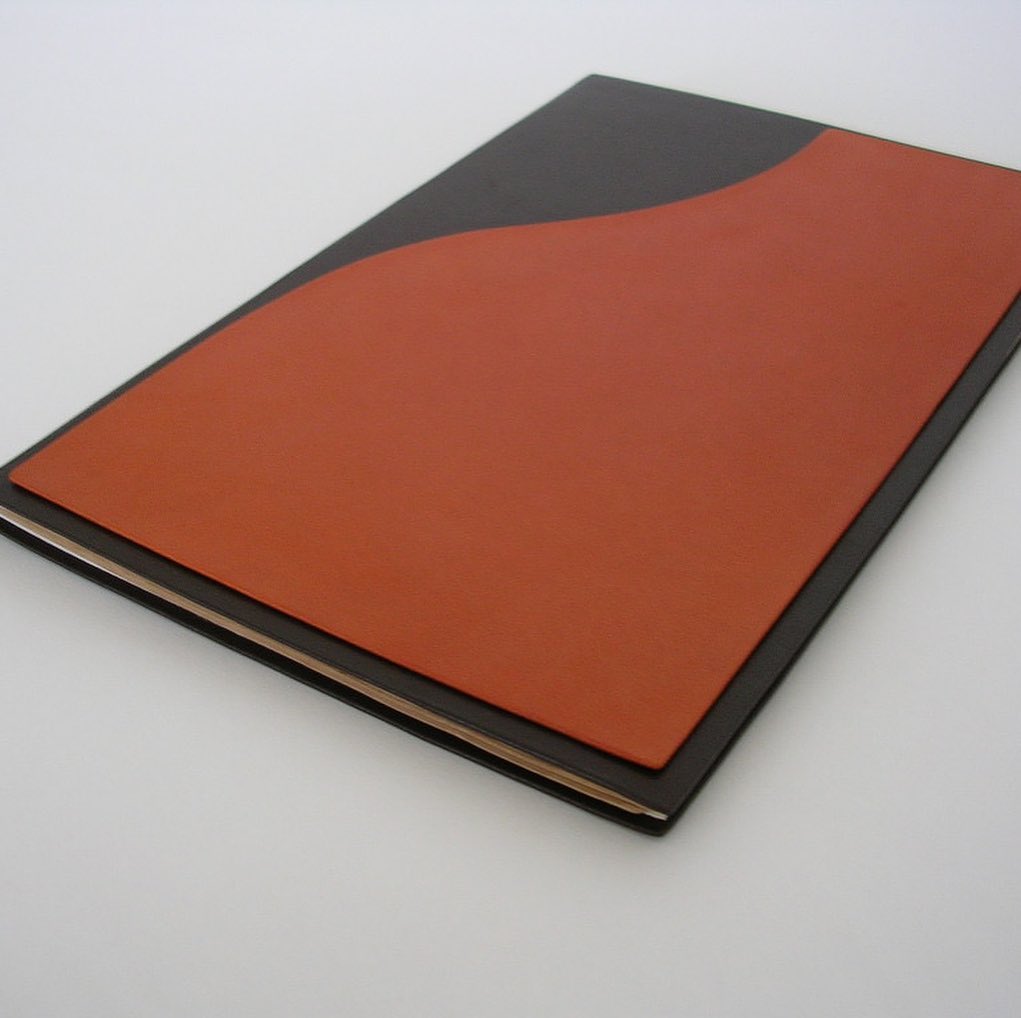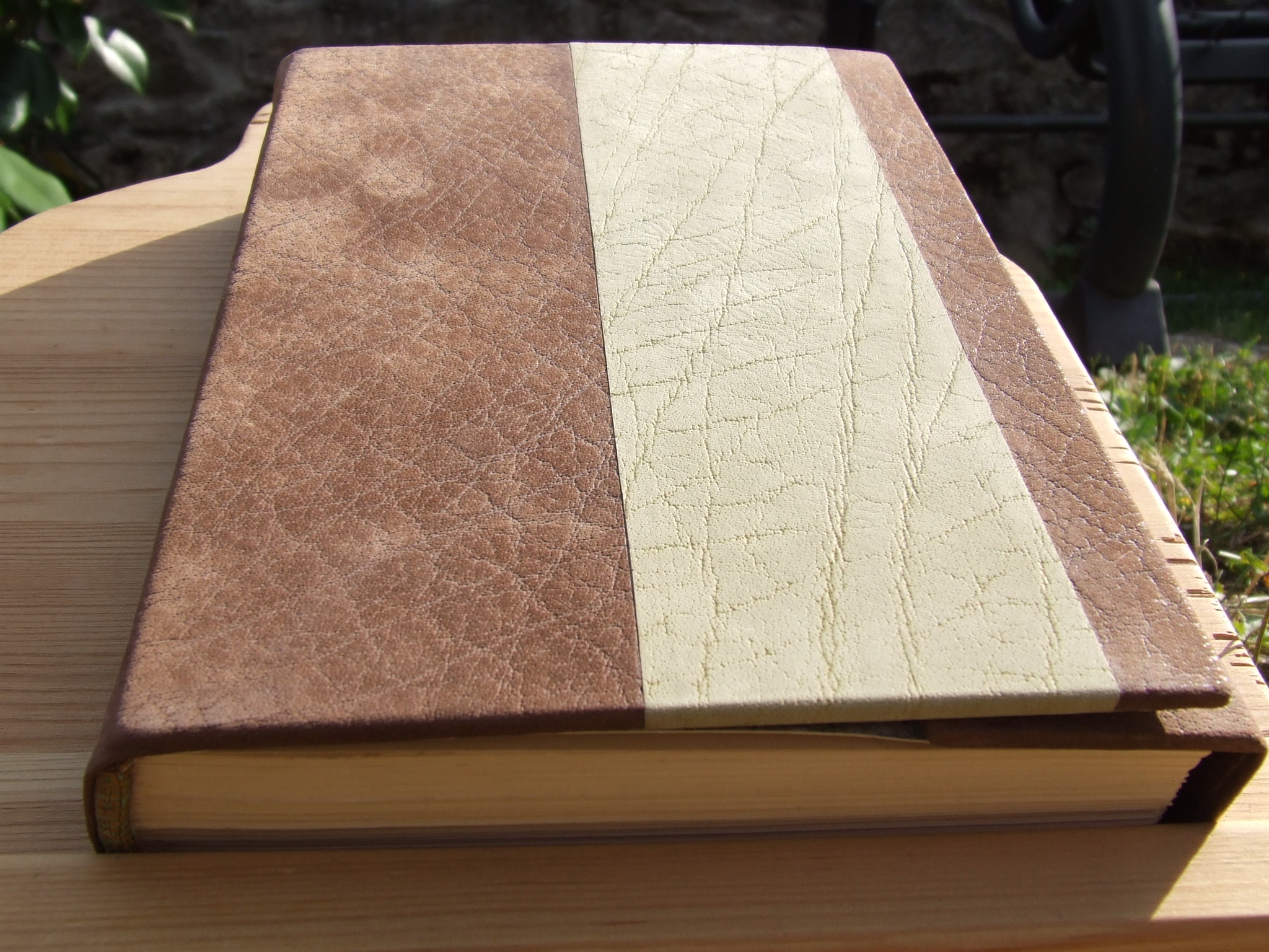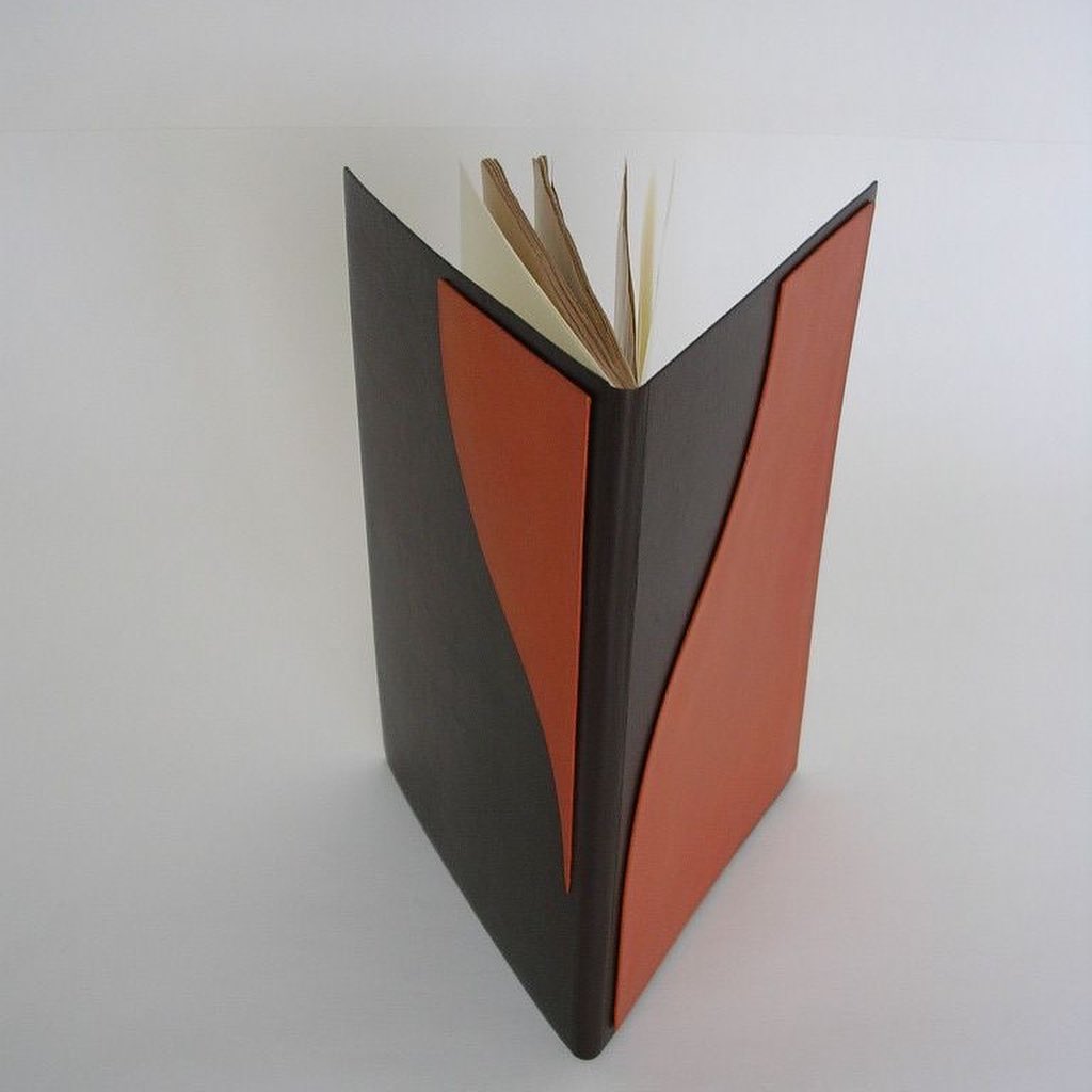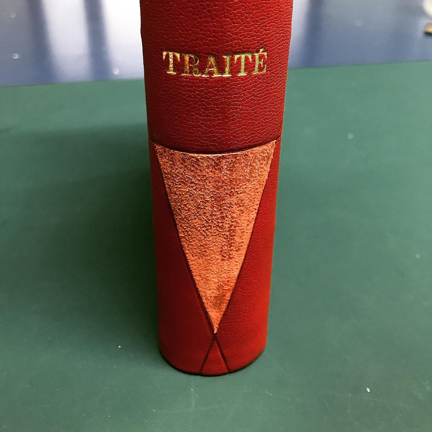 « Petite Histoire de la Musique » Ernest Van de Velde, 1924. Pleine peau sciée marron foncé avec ajout de plats en cartons recouverts de peau sciée rouge. Collection privée.