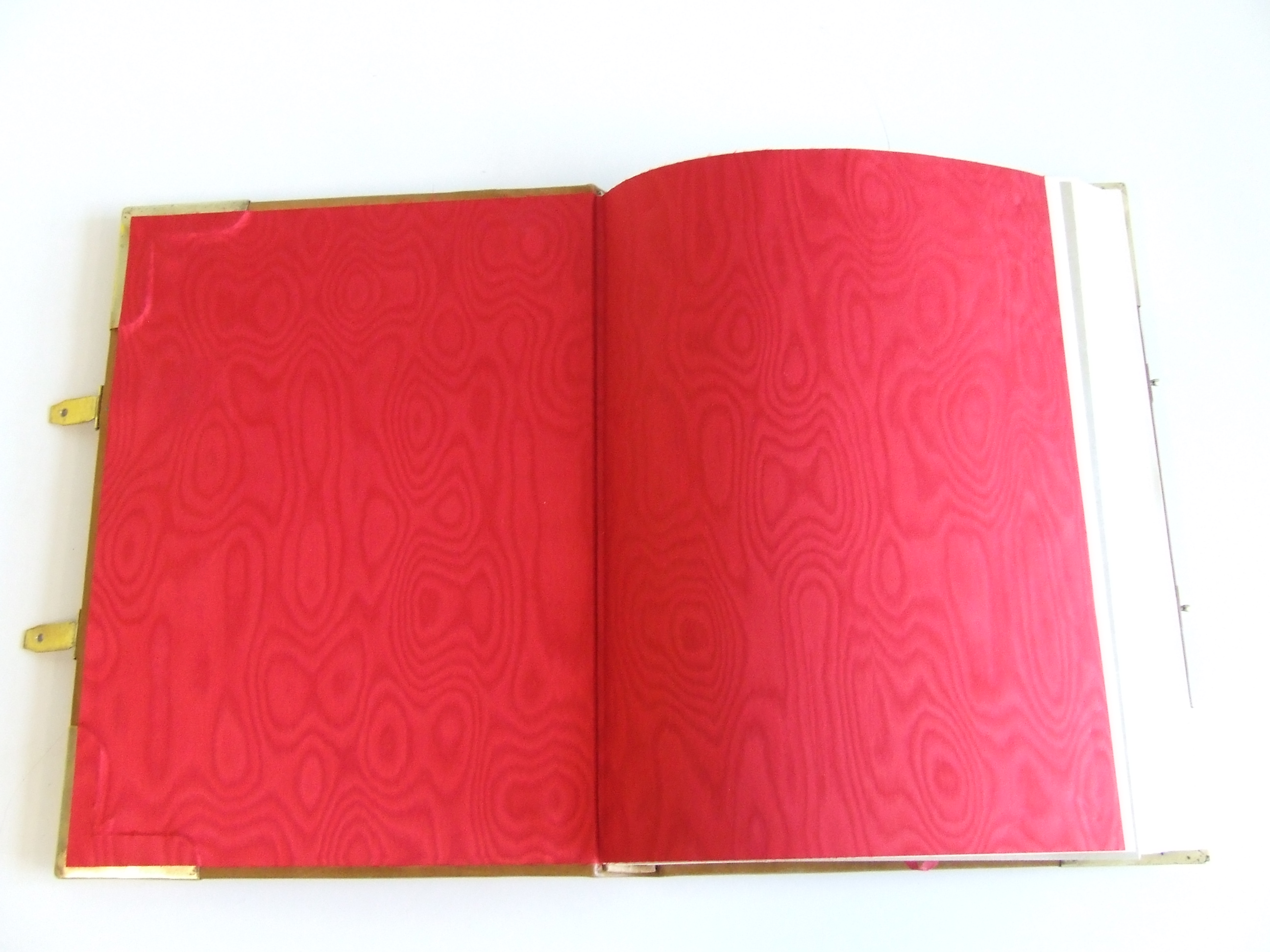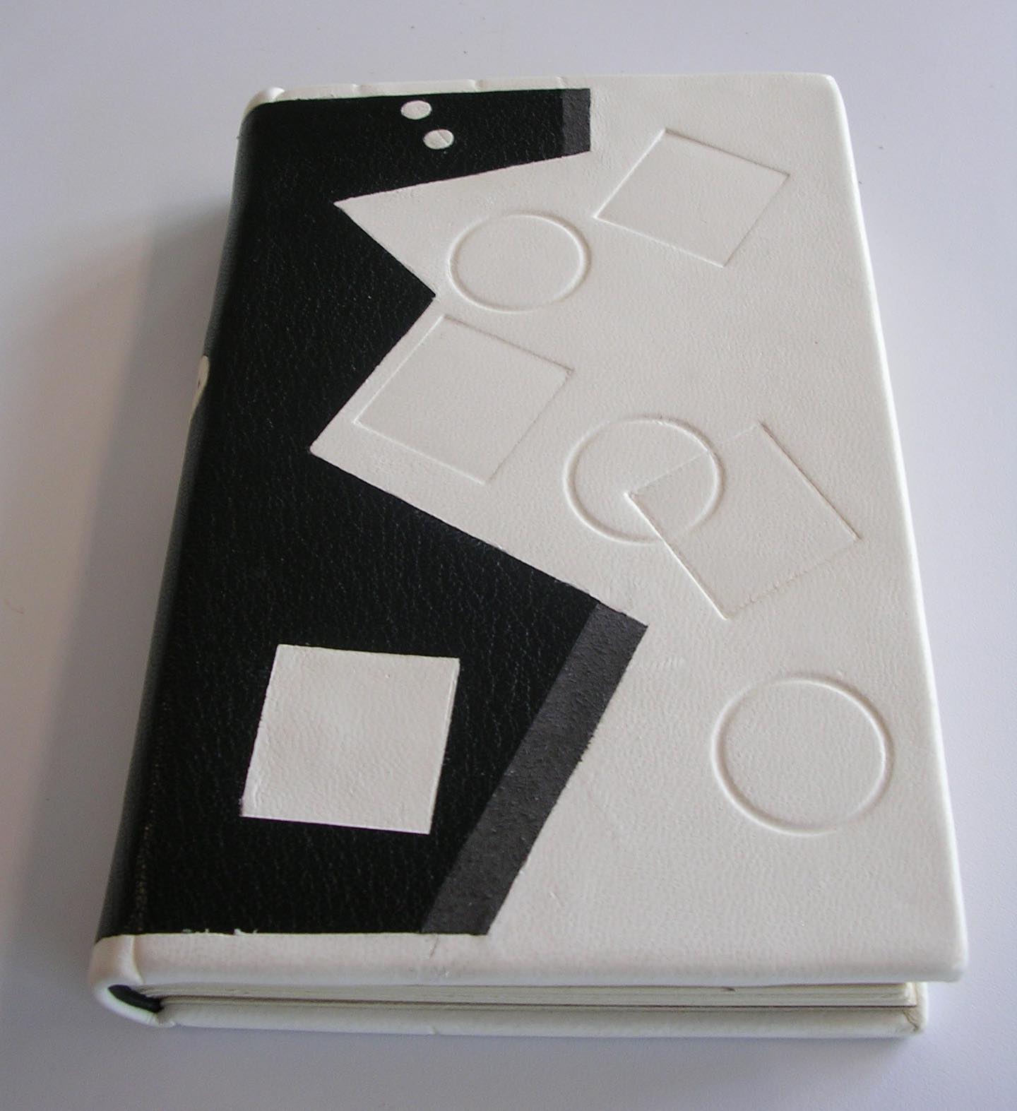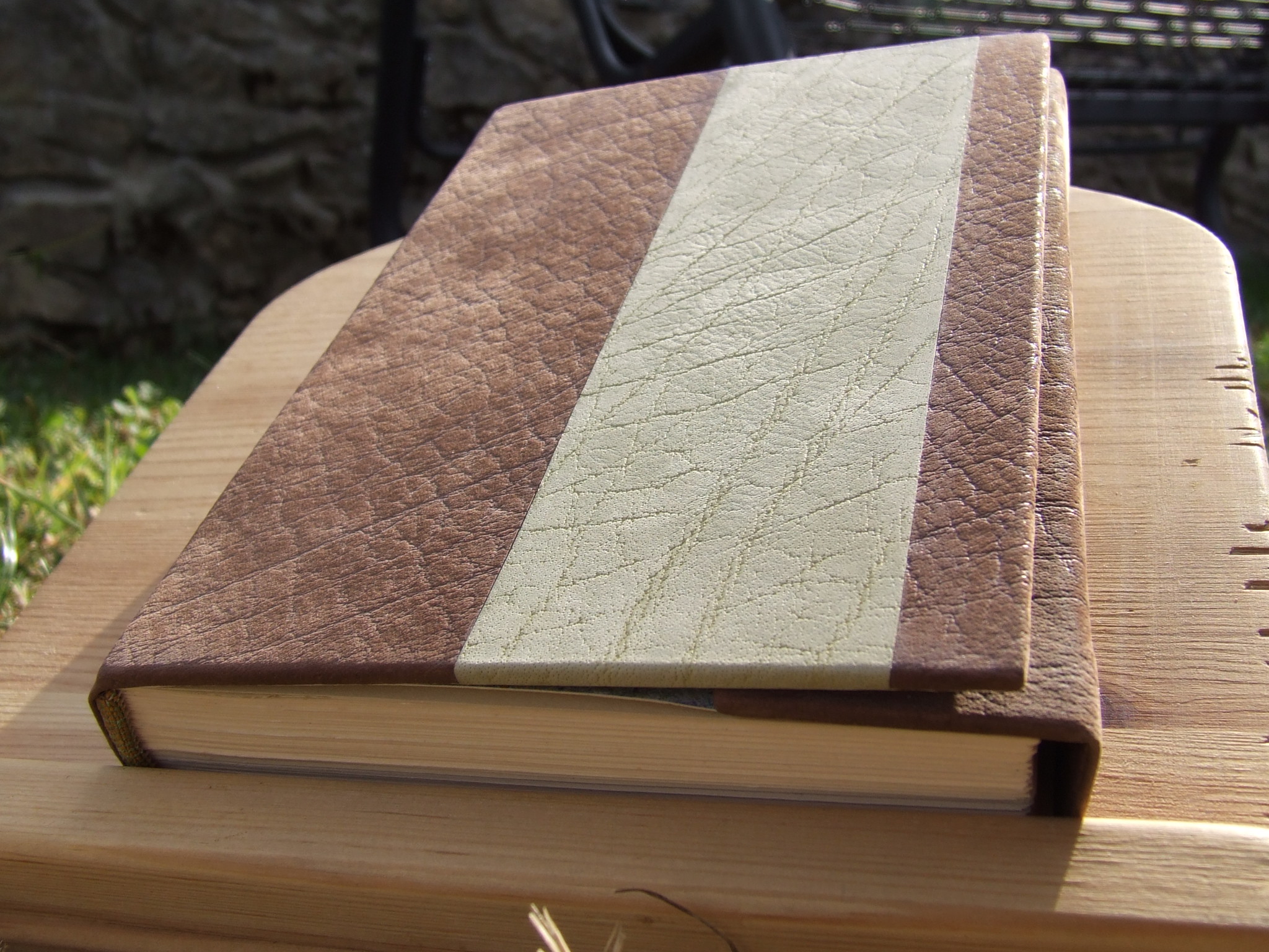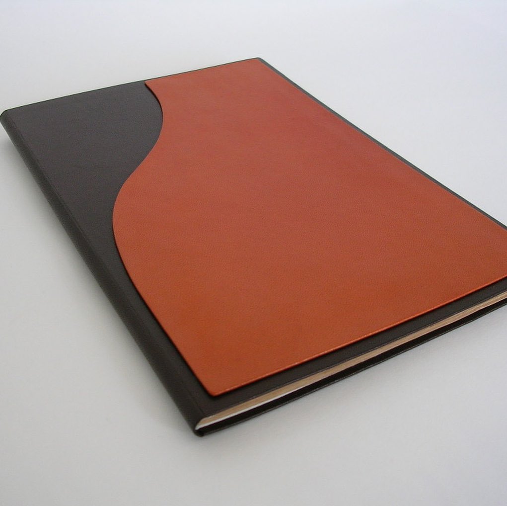 « Petite Histoire de la Musique » Ernest Van de Velde, 1924. Pleine peau sciée marron foncé avec ajout de plats en cartons recouverts de peau sciée rouge. Collection privée.