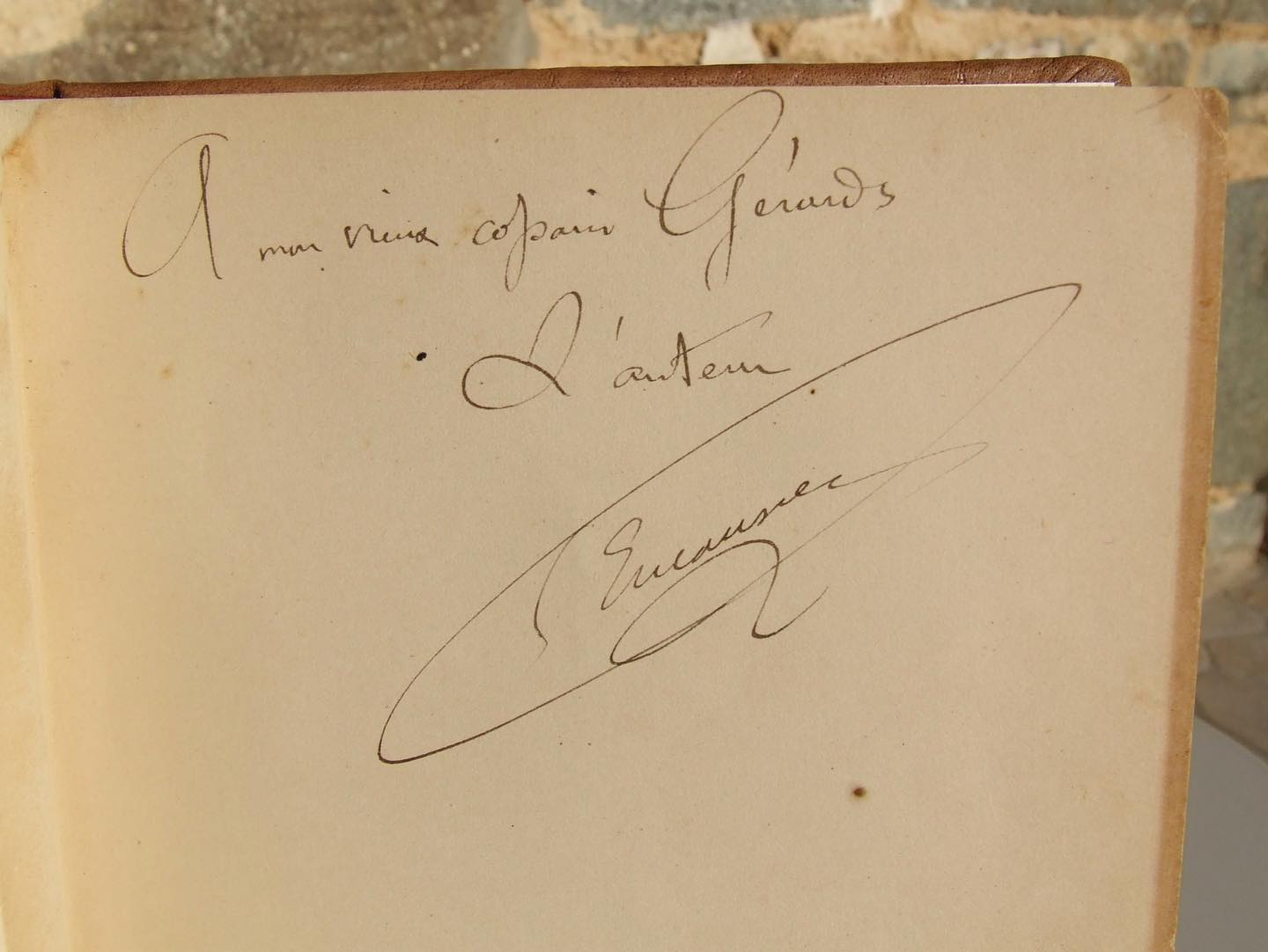 « Traité élémentaire de science occulte », 1888. Exemplaire dédicacé par l’auteur Gérard Encausse, dit Papus. Pleine peau megissée, mosaïque de cuir et marquage pour le symbole martiniste. Dorure à froid. Collection privée.