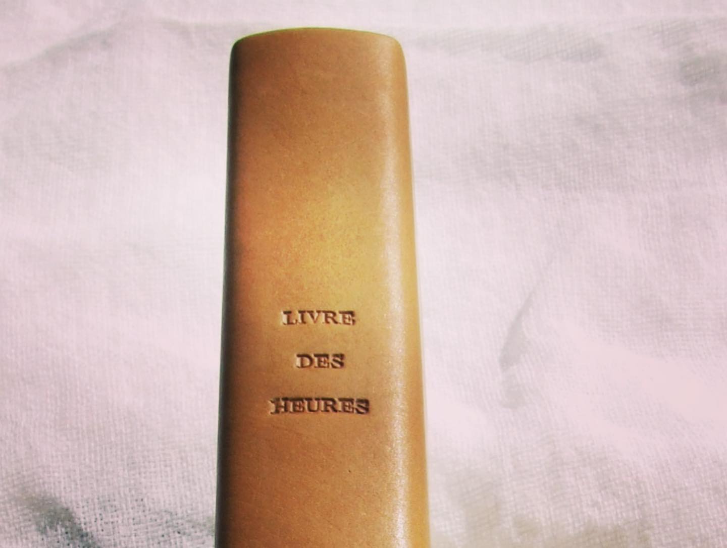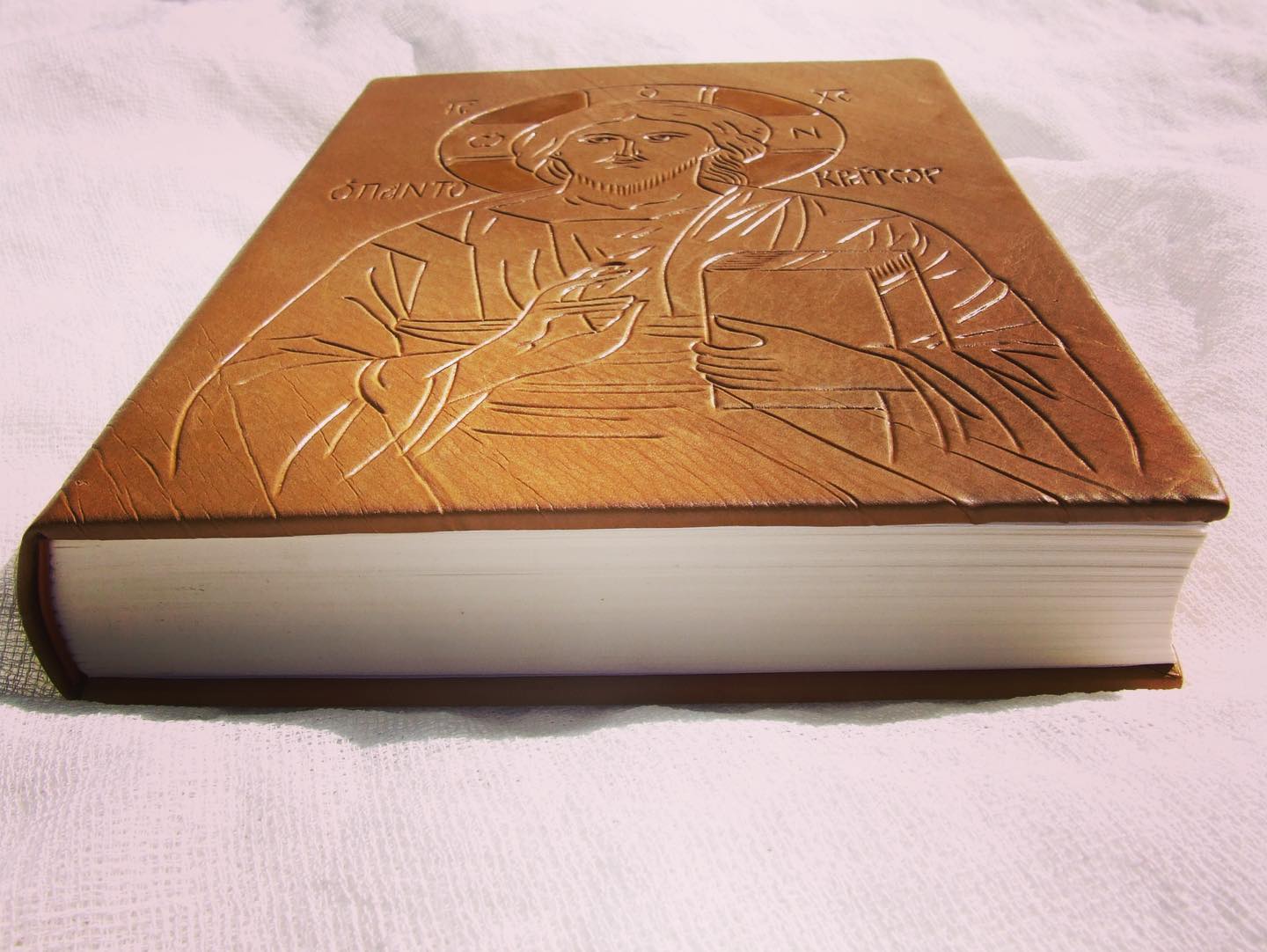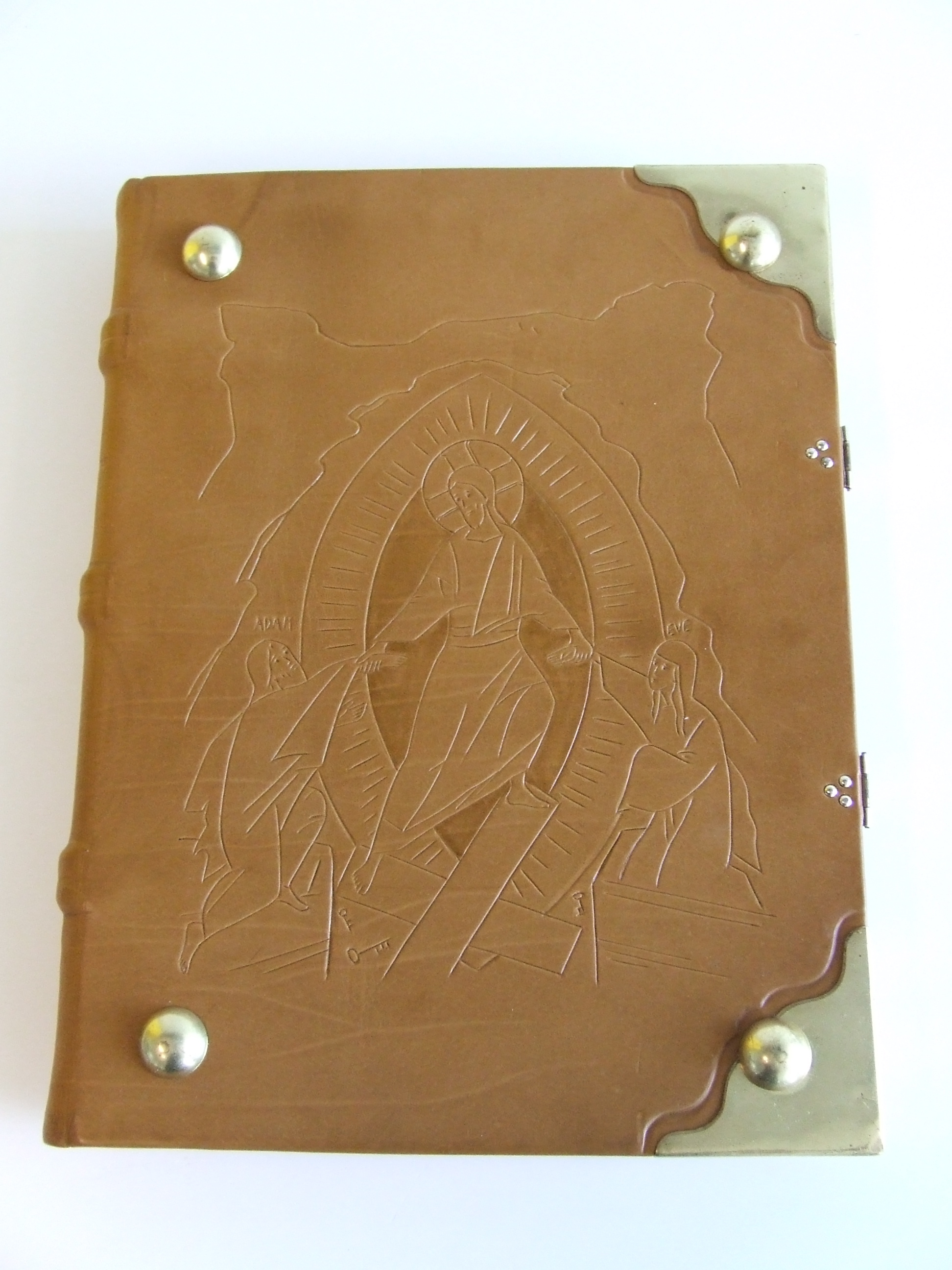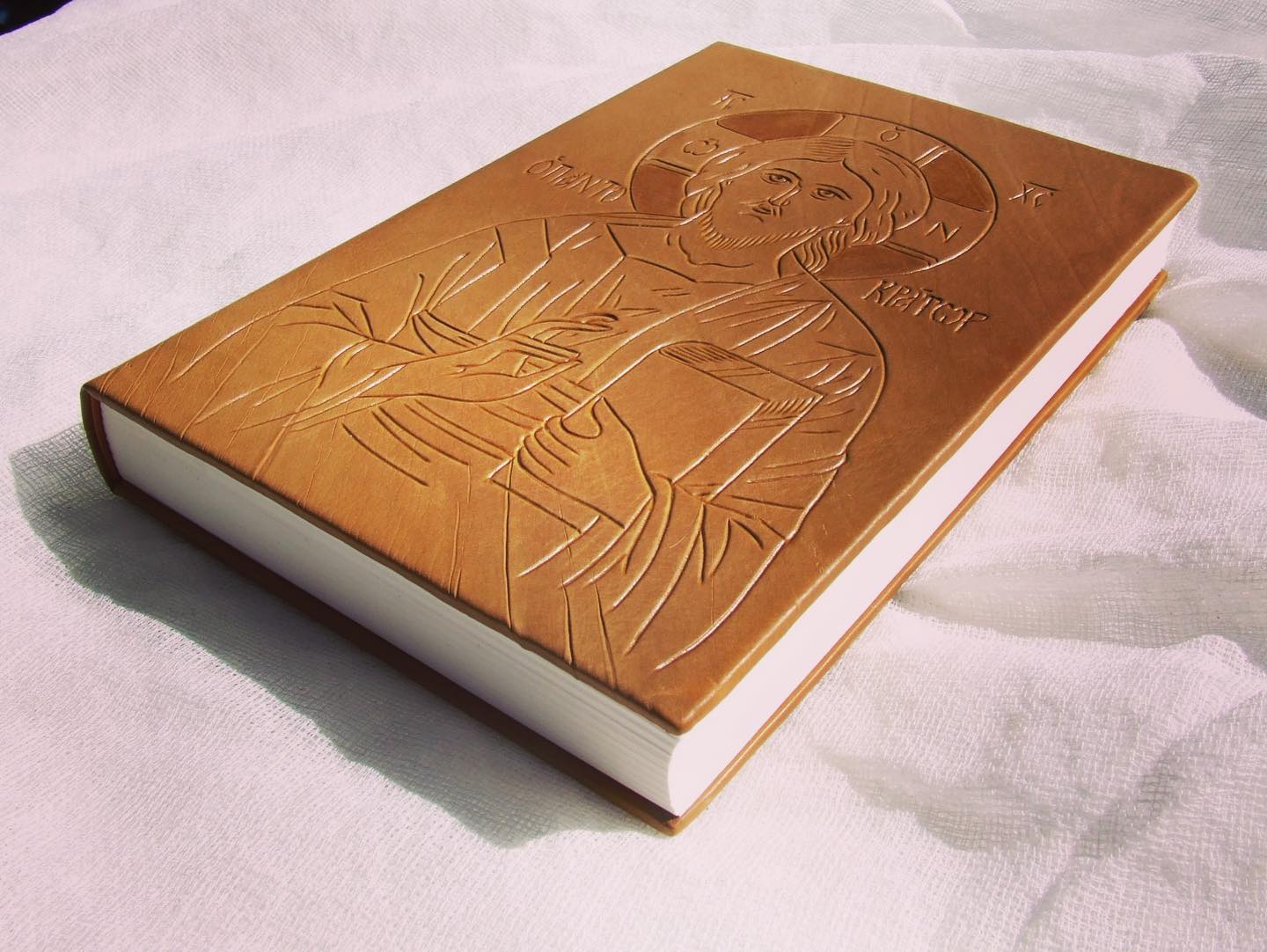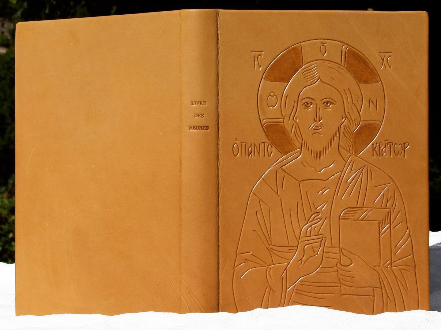 Livre des Heures, contenant les offices quotidiens de l’Église Orthodoxe. Reliure plein veau, avec marquage du cuir à la main d’un Christ Pantocrator. Dorure à froid. Collection privée.